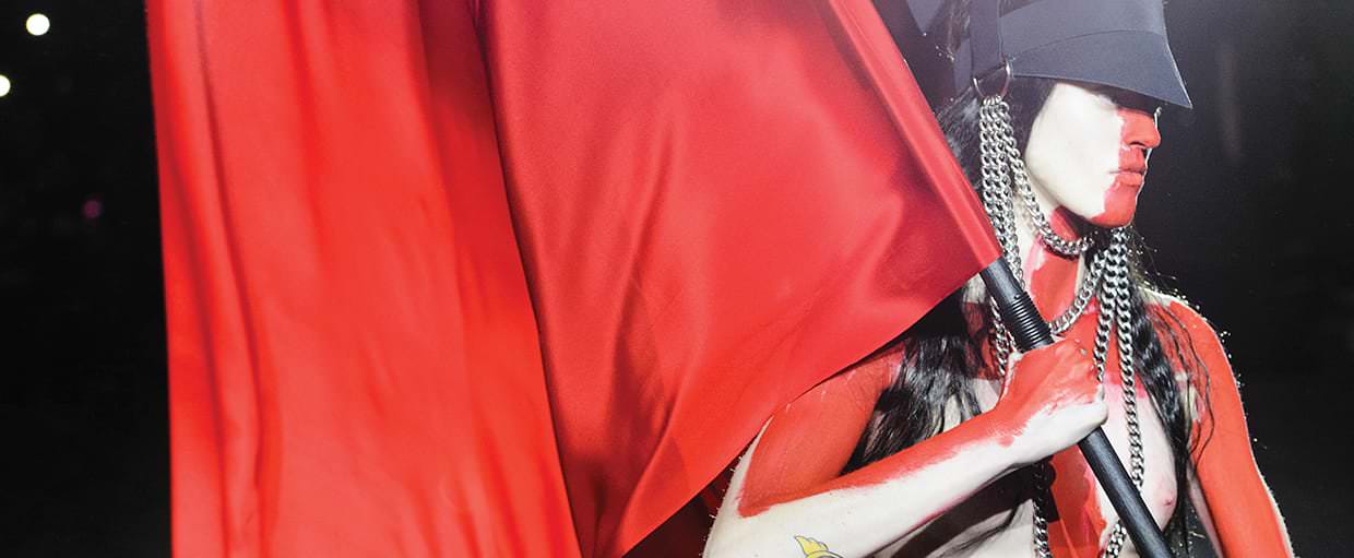 Gareth: Exatamente. E aquele espírito estava na coleção dessa vez. Eu estava pensando na ideia de se sacrificar para fazer algo que é maior que você, um ato cerimonial. Há um monte de motivos que aludem à ideia de se despir da sua própria identidade e comprometer-se com algo tumultuoso e além de qualquer pessoa enquanto indivíduo, em direção a uma mentalidade de grupo. O look do desfile dá uma impressão de bem agressivo, mas o que eu não gosto a respeito da palavra agressivo é que ela implica um estado mental que pode voltar a um volume moderado, mas eu o vejo como uma forma de ser. Não se trata de ser agressivo naquele momento, ele está implícito em tudo. A maquiagem é uma parte integral disso, na verdade, talvez mais do que jamais foi.