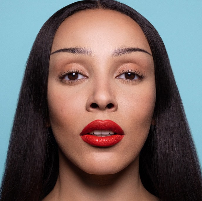 Use sem medo o Lip Combo da Doja Cat, com Batom Matte M·A·CXIMAL na cor Lady Danger contornado e definido com o Lápis de Boca no tom Cherry.